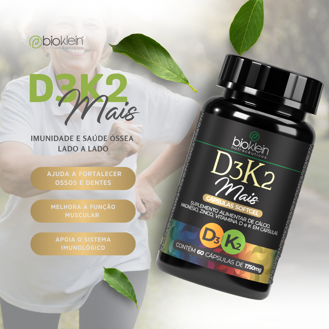 Vitamina D3 com K2 auxilia na absorção e utilização do cálcio, contribuindo para a manutenção de ossos normais e para o funcionamento do sistema imune.